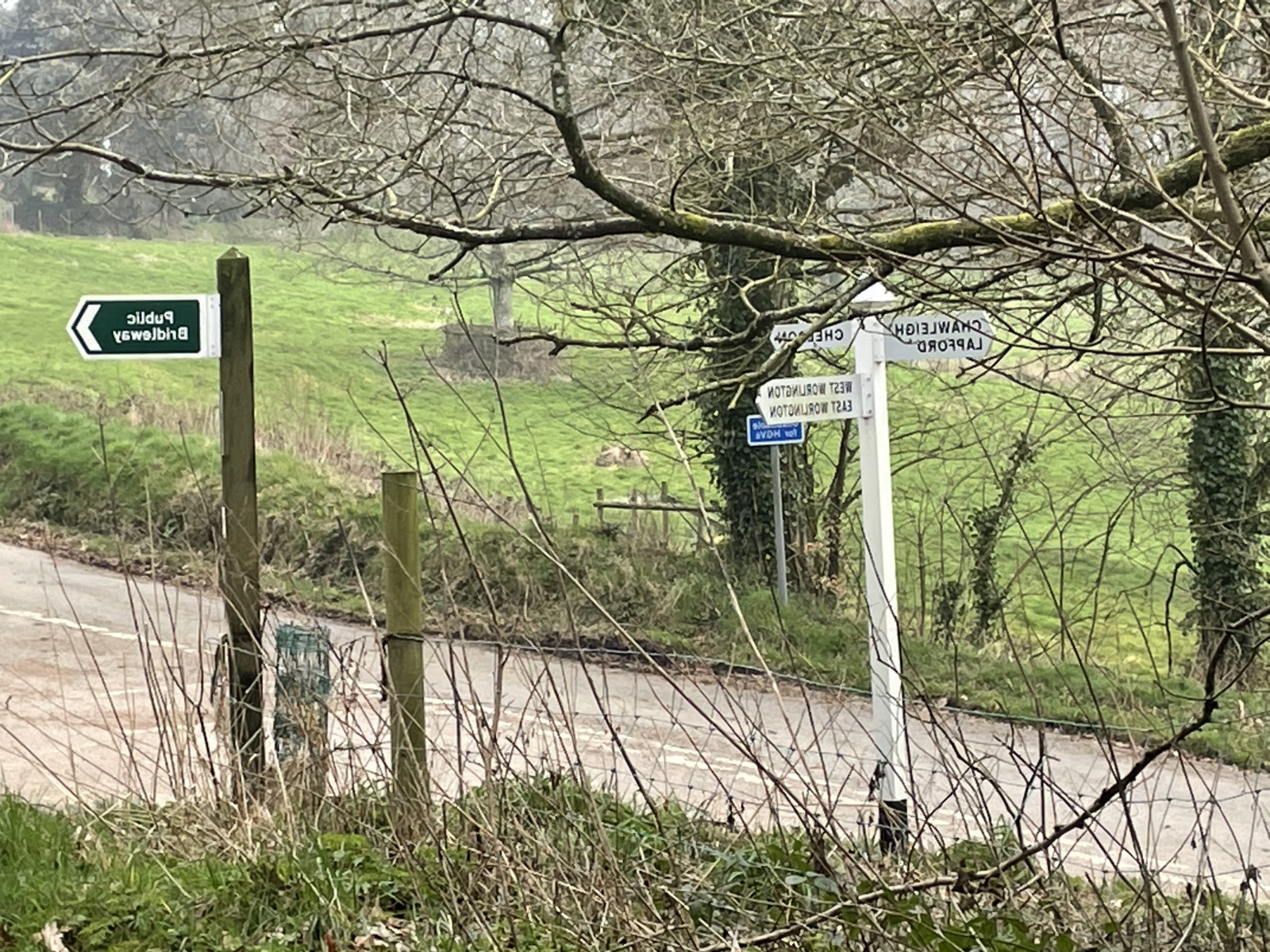 DAY 9Our third lane and footpath route to the Worlingtons from home is along the main road heading East to the bridlepath which turns South at Pedley Barton Cottage. Along that “top road” you go past the converted North lake Methodist chapel, Three Hammers Crossroads, and Yetheridge Caravan and camping park with it’s familiar line of trees which are a landmark for miles around. There are stunning views to both North and South. The two photos here show views North to Exmoor and dividing the fields which run alongside of the road are the widest Devon hedgebanks I have ever seen. Must be wonderful for local wildlife. . There were a flock of beautiful white doves overhead as I turned down the bridlepath North past Pedley Barton and on through the meadow into the woods passing views towards Thelbridge and the houses and farms on the Drayford lane. The muddy woodland bridleway takes you over a little stream and back to the two bridges. We then went along the top paths through the woods and past the little quarry. This brings you out at a junction bearing right towards Drayford and left back towards Worlington. We went around through Drayford having a little river stop for Molly on the village green, before going back along the lane towards East Worlington, across the meadow path and past the school and church. Left past the village hall and back down the hill to Edgelake bridge and the car. Another lovely sunny walk with thoughts of following paths which had been trodden by local people for centuries before. 4.1 miles covered today |