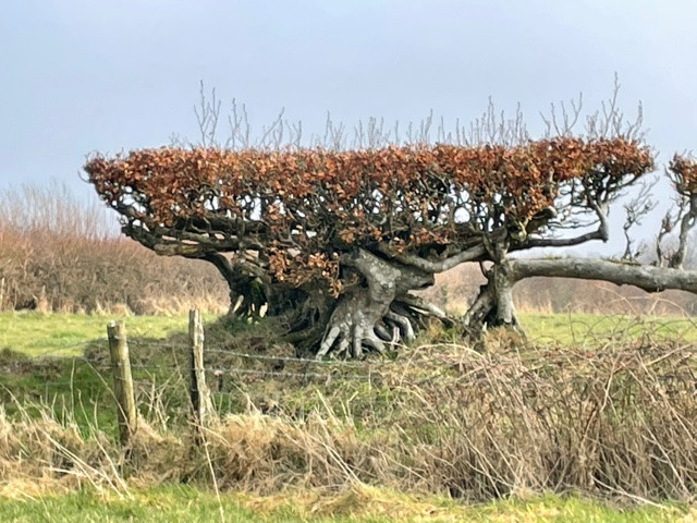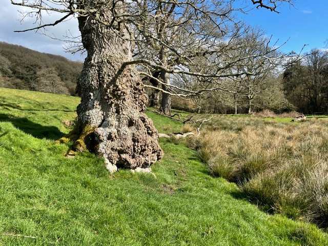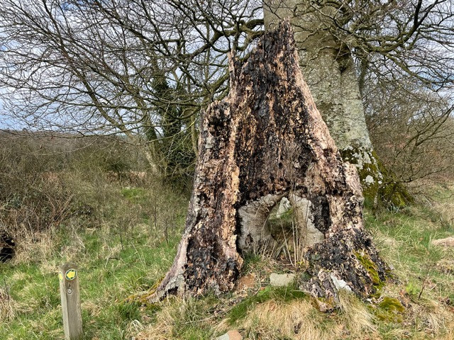 DAY 22A local friend popped over who hadn’t done the “old settlement route” before so she asked if I would show it to her. I have put lots of pictures of this well documented round on previous days so was looking out for anything new to snap. The first was this old and enormous tree stump along the green lane towards the old Sowden’s Burridge Farm (now gone to ground). I remember when the tree was standing in all it’s magnificence then it came down in a storm and totally blocked the route for a good long while meaning that we went round the back of the roots via the field. The undergrowth grew up and it became dense, hiding animal runs through and round it. Then it was cleared and now the stump remains along with the remainder of the trunk on the opposite hedge. The stump is an amazing host for all sorts of fungi. Some very large, one of which exploded on me once, covering me with orange powder. (I confess I did poke it with the end of my stick). I lived to tell the tale. All around the base of the stump this year’s juicy new nettles are appearing. Just the right size for nettle soup if you fancy that. (it tastes like spinach). At the bottom of the settlement on the north slope going down to Cheldon Bridge is a new conifer plantation. The old crop was felled a few years ago now and the new crop of babies are looking well established. We spotted the first stitch wort on the bank around the settlement. They join up in April with the blue bells making blue and white hedgerows to take over from the previous yellows of March. More tree sculptures which reminded me of a torso with arms bent at the elbows and flexing muscles. The settlement is a hide and seek heaven for children playing outdoors. What I hadn’t mentioned in earlier posts was that this route is part of the aptly named Ridge and Valley walk which links The Tarka Trail and The Two Moors Way with a 12 mile route along the Little Dart Valley. So back across Burridge Moor with some elemental skyscapes and views North and South to both Moors. A walk I never tire of doing. 4.3 miles. |