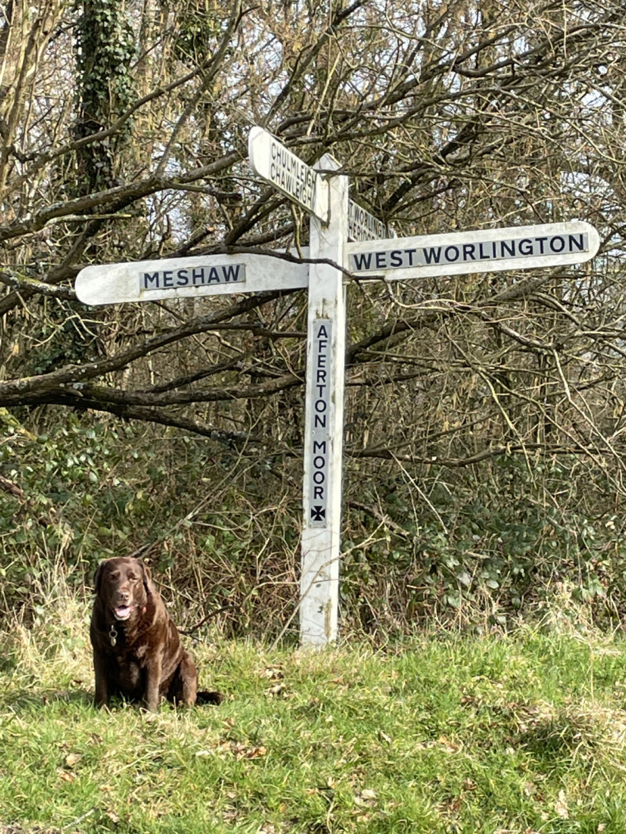 DAY 25The final day of my challenge and it has been quite an experience in many ways. The sun was shining and I knew I had to make no mistakes on the final lap. Paul was waiting until I had finished to sponsor me! no pressure!!!!!!! We have done the footpath part of today’s walk only once before and once again you see the familiar parts of the local landscape from just another perspective. It takes you to the top of the world and down into the river valley with fabulous panoramic views. We set off from Drayford once again and once over the bridge of the Little Dart we turned left and headed North East along the river valley towards Witheridge. Spring blossom were all out in the gardens along the route. Before we passed the Quarry entrance I spotted the resident peregrine. I always have to look carefully because I don’t trust my bird of prey identification skills very well but Paul confirmed my spotting and he is usually right about such things. That’s twice in a couple of weeks. A real treat. The sheep sign on the side of the road made me smile. This is such wonderful sheep country but great to be reminded that they share the lane too as they move from pasture to pasture as they have done for centuries past. Then along the familiar but different river valley, there was an apple on a gatepost. What was the story here I wonder. One for a writing exercise for children in the village school with the who, what, where, when and why prompts. Rabbit burrows line the roadside along here and over the hedge there are views over to West Yeo as the lane heads more East away from the river. As you go past Coombe house there are glimpses of the fabulous garden with orange barked shrubs and hyacinths and daffodils beds. The footpath which used to go off right here through a crew yard has been diverted and now takes you on up the road right to the edge of Witheridge past the cockerel sign on the way. Strands of sheep’s fleece caught on the wire dancing in the strong breeze were like a miniature washing line along the fence there. You bear right and follow a ring road style path through a new plantation south of the village until you come to the signs for the Two Moors Way and the Ridge and Valley Walk. The latter takes you back towards the River Dart but one of the signposts was a bit confusing with subtle directional pointers that needed thinking about. Golden willows mark the edge of the village and the start of the meadows. You can, from the top meadow, see back down to East Worlington. (nowhere is very far away although you can feel a sense of remoteness). Over a couple of high meadows with more stunning views you reach the lake of Coombe House lined with more willows of different kinds. You look sideways at the farm yard where the footpath was once routed. We found the OS map vital here to find the line of the path, although it is clearly marked with the yellow arrows between the meadows. The landmark wind farm at Batsworthy is clearly visible to the East and back towards Witheridge once again the church tower is prominent. Then all of a sudden at the top of the hill the high tors of Dartmoor are visible to the south. Over the next brow you skirt around Thelbridge Hall which was shrouded with smoke from a bonfire as we passed. All the paths are really well marked and take you easily along to join the lane between Thelbridge and Drayford. It is all the Ridge and Valley path which then goes on back down to Drayford and on to the West along the valley. Surprisingly, on reaching the car, I found I had another quarter of a mile to go to make my 4 miles so I walked from Drayford round the road to the village Hall in East Worlington. As I reached the cross roads two local ladies were chatting on the corner and as I approached they clapped. We did a little photo shot and felt very much supported on the final stretch back to the car. Thanks Becky and Marion! A wonderful walk indeed and in total 4.1 miles. |