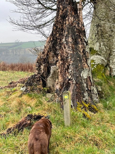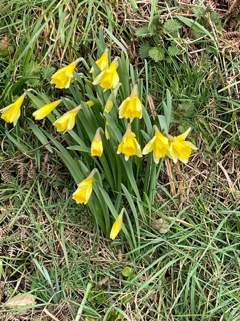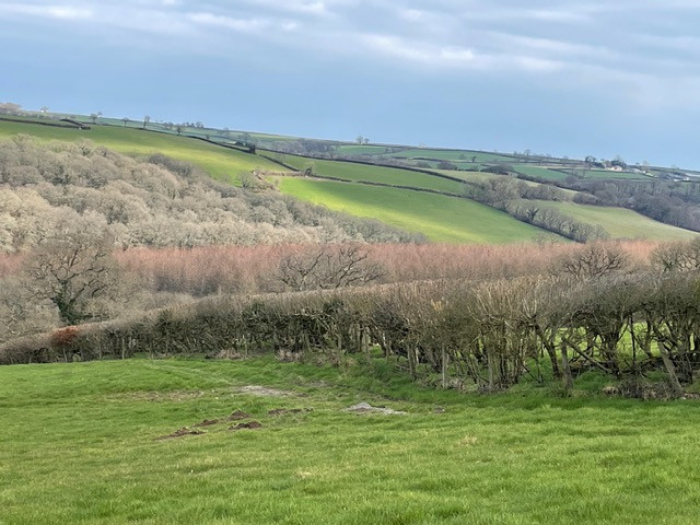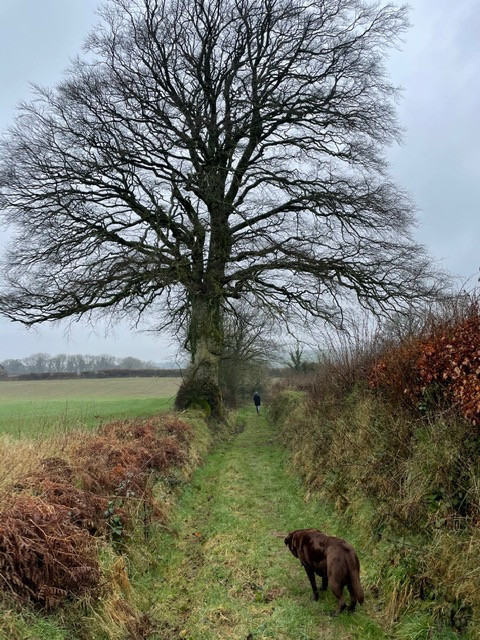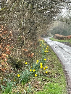 Day 14Today we did a loop north of the little Dart River and a couple of miles West of our Worlington villages incorporating the little village of Cheldon. The map photo shows the route we took. (Apologies that the map is not straight on). We parked up at Leigh Bridge and started on one of our favourite footpath stretches walking East along Cheldon meadows through the woods and along the next stretch of meadows to meet the lane at Cheldon Bridge ( about a mile) through wild daffodils, ancient oaks and signs of otters by the river bank.(Molly likes to roll!!!!!!!). We turned left up a long hill past a little field barn which I have watched “going to ground” over the last 20 years, alas. Heading up towards the main ish road which heads along the ridge towards Chulmleigh we did a detour into the little village of Cheldon and were stunned by the church yard absolutely jam packed with wild daffodils. A fantastic sight. Back to our route and on up past lovely views across to Mounticoombe Farm to the East and on to the south and Dartmoor. At Cheldon cross farm we turned East towards Chulmleigh and shortly afterwards South past views towards Chulmleigh and again over to the moors. We passed sculptural beech woods with statuesque root systems which lined the lane. A steep downward walk took us to Stonemill Farm and back to Leigh bridge and the little River Dart again. A round of 4.8 miles. |