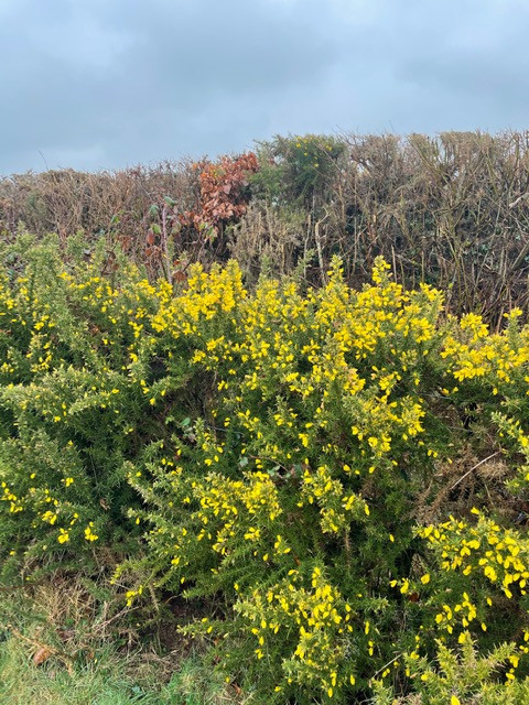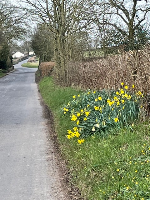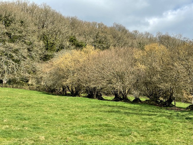 DAY 15The familiar walks always spark something new and different. So another walk down towards Horse Hill turned into somewhat of a “ yellow day”for my focus. Unplanned but just evolving. The yellowness all around right now is such a heartening sight. I was taken by the view and light looking North East from Roundash back over Risdon and on to the familiar line of trees which mark Yetheridge Caravan park. Then having crossed the meadows via the footpath I decided to double back and walk down the lane to see if there were signs of the early purple orchids on the bank going towards Horse Hill cross roads. I was in luck!!!!!! And of course the promise of foxgloves tucked into hedge sculptures. From there on through the village, a variety of different types of daffodils including the most beautiful delicate wild ones and the miniature tote a tote. Lots of the blousy, doubles ( butter and cream variety we used to call them as children). Celandines, dandelions, primroses, wild spurge down by the muddy section on the bottom road, forsythia tumbling over a wall and yellows orange stems of willow. A very happy “ yellow walk” today. 4.3 miles covered.