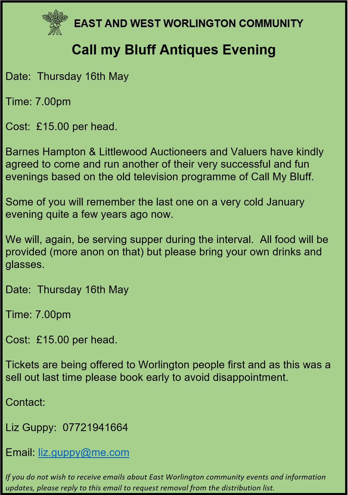 Call my Bluff Antiques Evening 2024 Barnes Hampton & Littlewood Auctioneers and Valuers will run another of their evenings based on the old television programme of Call My Bluff on Thursday 16th May: starts 7:00pm, cost £15.00 per head.