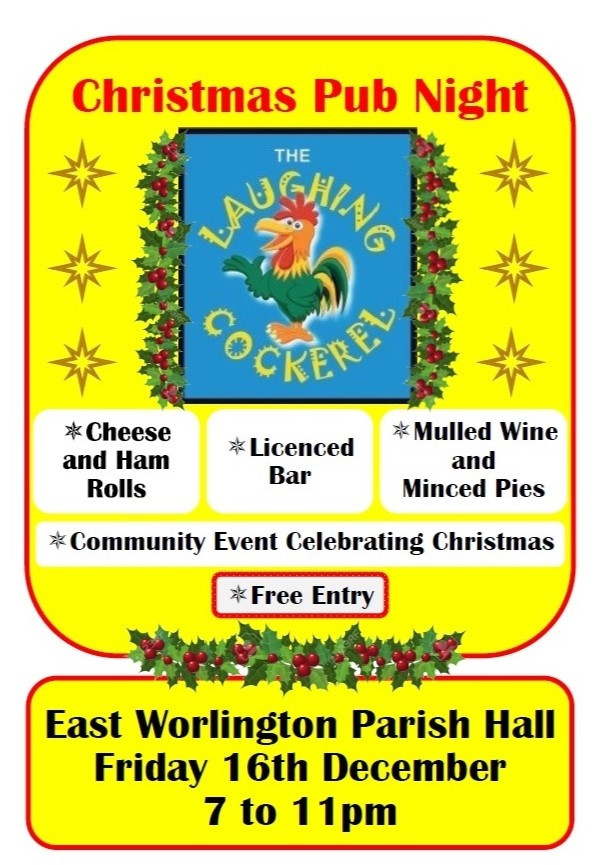 Christmas Pub Night 2021 Our next community pub night is on: Friday 17th December between 7.00pm and 11.00pm at East Worlington Parish Hall. No entrance fee Licenced Bar Buffet available as reasonable costs A Christmas Jumper and Hat Competition. Free to enter for those wishing to come with a Christmas Jumper or Christmas Hat. The evening includes a Christmas Music Quiz A small entrance fee of £1.00
