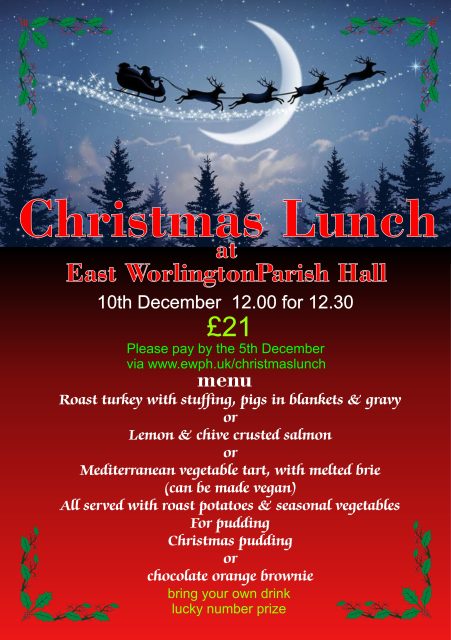Christmas Lunch 2025 The 2025 Christmas Lunch will be on Wednesday, 10th December 2025 12:00 for 12:30 start. Tickets are £21 per person and can be purchased from: https://east-worlington-parish-hall.sumupstore.com/product/christmas-lunch All menu options available as gluten-free on request. Please purchase your tickets by 5th December.