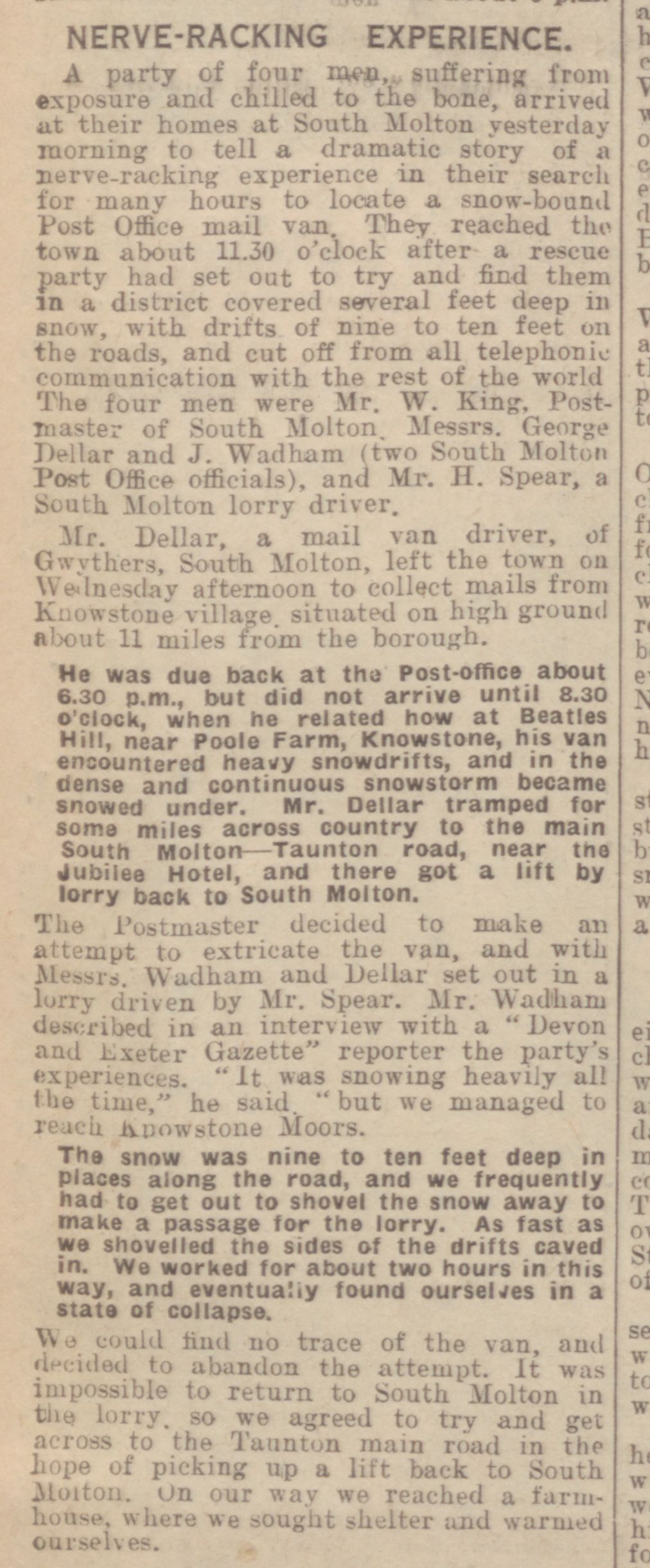 Press Cuttings Archive Form Return to list of Cuttings Title: Nerve Racking Expeience. Post Office Van Stuck in Snow Drift on Knowstone Moor Unique Reference: Date:27 January 1939 Categories: Events, People, East Worlington Source:Exeter and Plymouth Gazette Uploaded By:Steve Baber on 30-Mar-2026 Information:A Post Office van became stuck in high snow drift near Knowstone and the driver abandoned the vehicle and walked to the main road where he managed to get a lift back to South Molton.Post Office. The following day the van driver and three other men set out in a lorry to recover the vehicle. They encountered 9 and 10 feet snow drifts on Knowstone Moor and they spent two hours digging the lorry out of the drifts until they became exhausted. They could not move the lorry and they did not find the van.. So they decided to walk back. They knew they couldn't walk to South Molton so they decided to walk towards the main road. On the way they came across a farm house where they found sheltered and warmed themselves. Image sizes:medium, large, thumbnail, full size(1012x2439) Download: Snow Exeter_and_Plymouth_Gazette_27_January_1939 Nerve Racking Experience South Molton.jpg Click to view full imageClick on on filename below image to download.