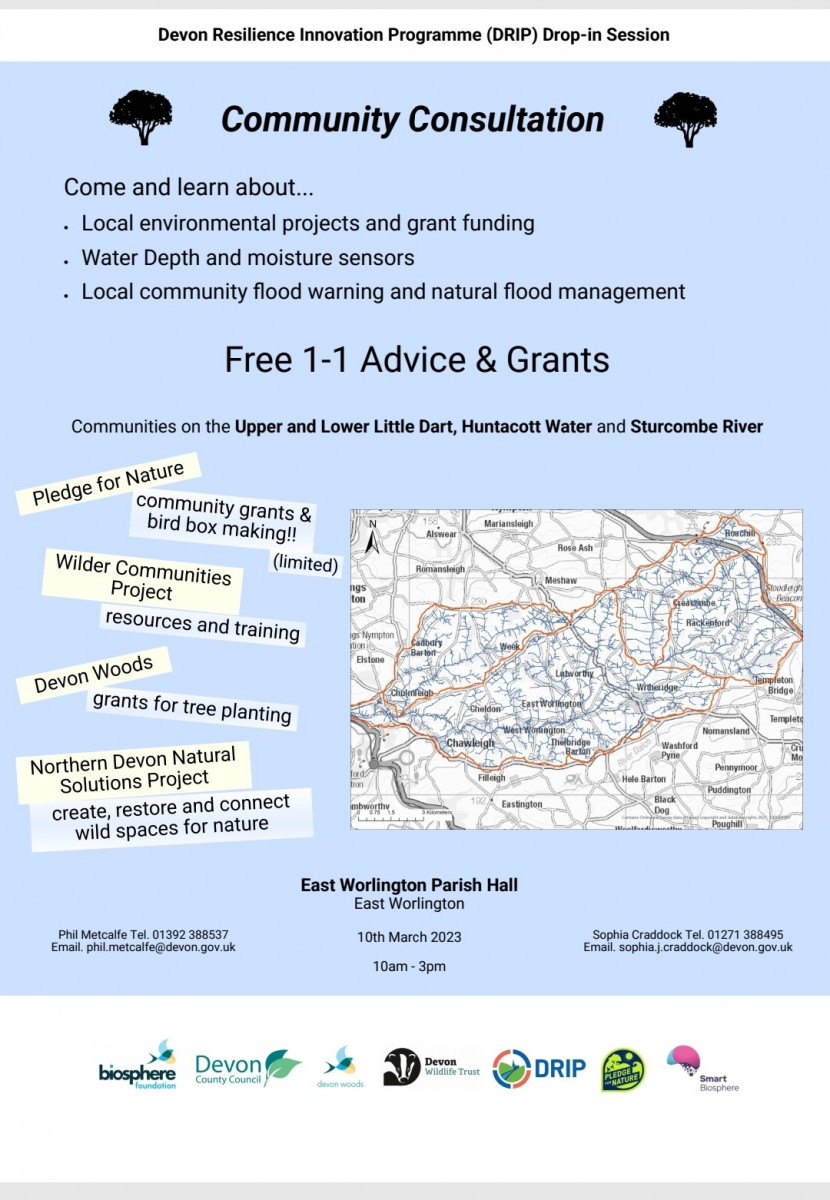 Devon Resilience Innovation Programme (DRIP) Drop-in Session Fri 10-Mar-2023 by Martin Bond Learn about local environment projects, local community flood warning, natural flood management and grant funding. Drop in session 10th March 2023 from 10:00AM to 3:00PM.