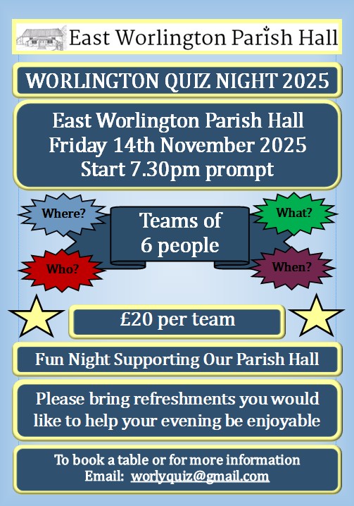 Quiz Night 14th November 2025 Friday 14th November, 2025, starts at 7:30pm. Entry fee £20 per team of up to 6 people. Bring your own refreshments, nibbles and drinks.