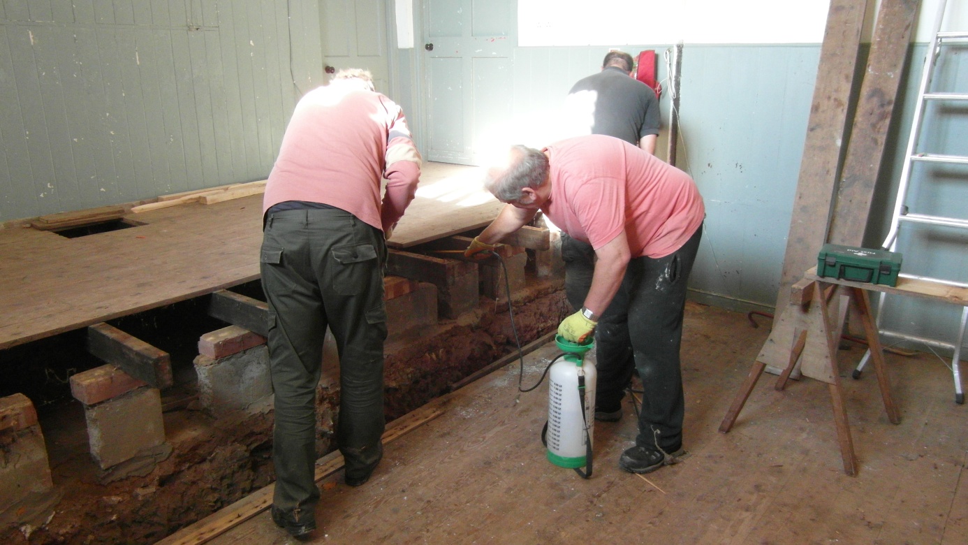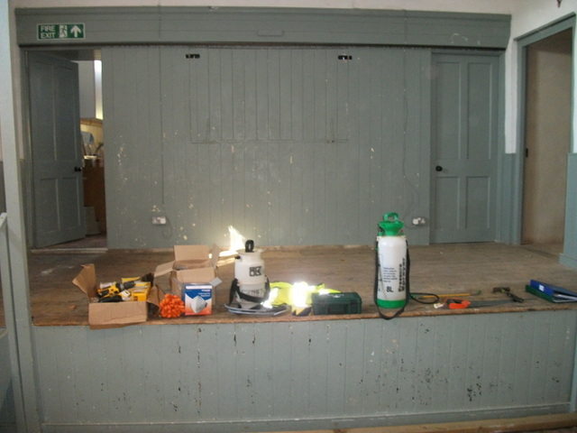 There was some concern that packing under the stage may have been asbestos sheeting so a portable water sprayer was used to damp down any dust.
