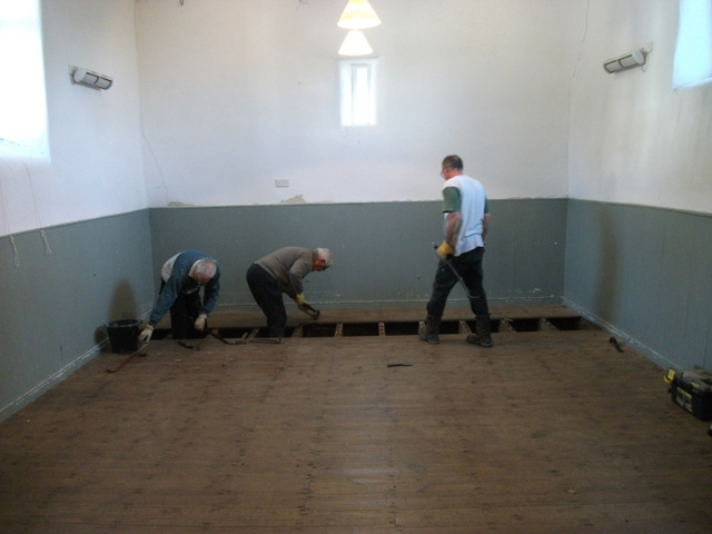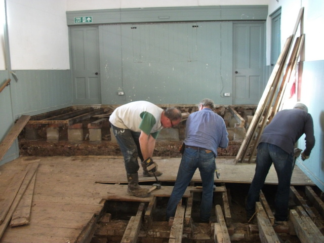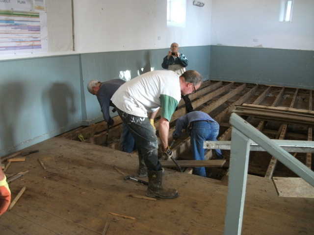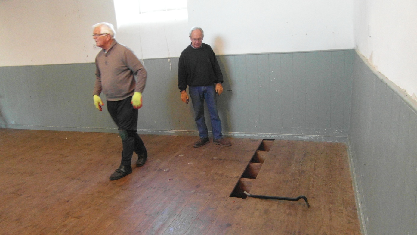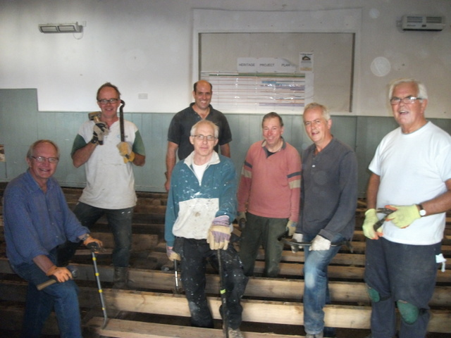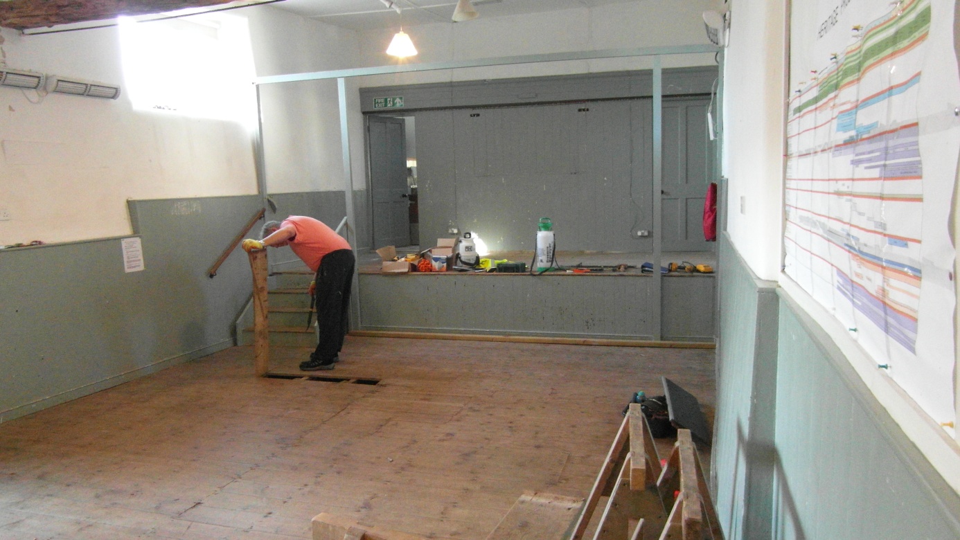 By lunchtime on Monday 12 October, 2015 after the hall had been cleared community volunteers started the on lifting the flooring in the main hall and store room, and removing the stage.
