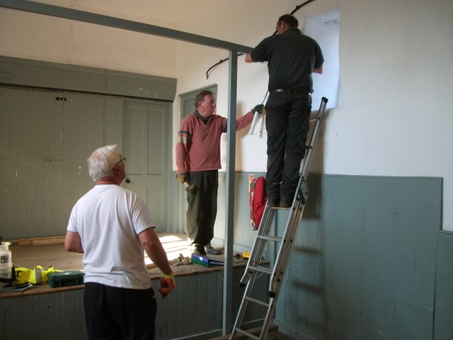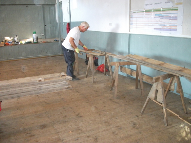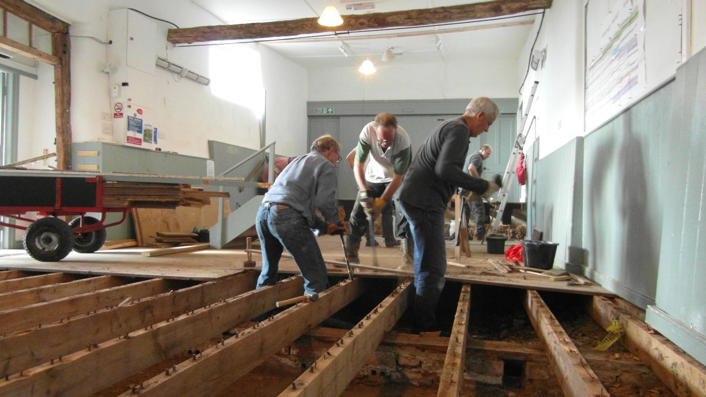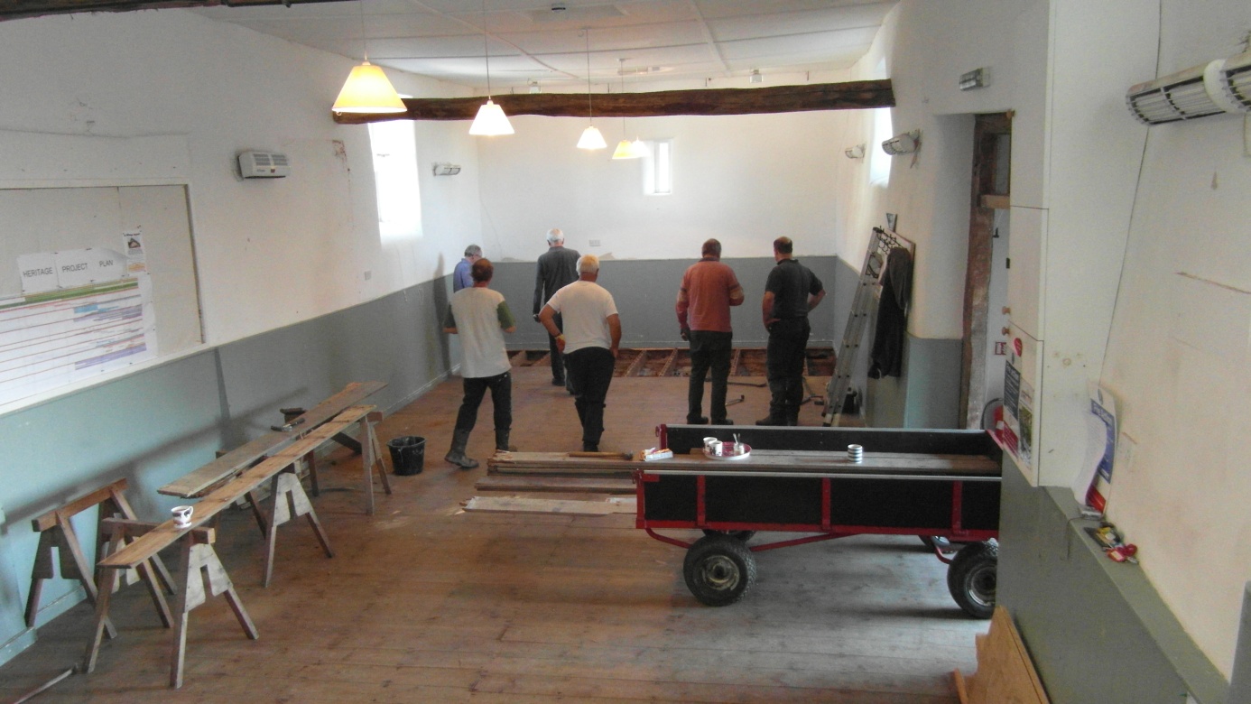 An hour and a half into the work and the discussion over a tea break decides progress is slow but steady.After the tea break and with work finished in the store room, the progress in the main hall picked up as the volunteers worked out the best techniques for lifting boards.