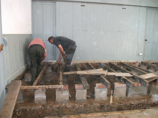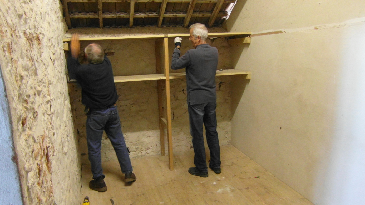 Meanwhile a small crew started in the store room and removed the shelving from the north wall where the heating boiler and underfloor distribution manifold will be positioned. The floor boards in the store room were lifted ready for the builders to lay in the heating pipework. The floor boards were kept in the room and will be relaid once the heating has been comissioned.no images were found