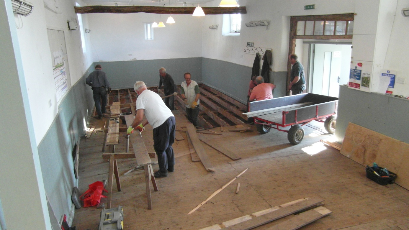 After the tea break and with work finished in the store room, the progress in the main hall picked up as the volunteers worked out the best techniques for lifting boards.