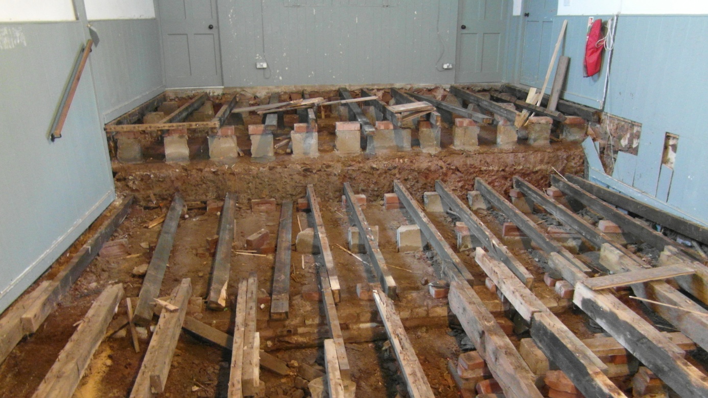 By lunchtime on Monday 12 October, 2015 after the hall had been cleared community volunteers started the on lifting the flooring in the main hall and store room, and removing the stage.
