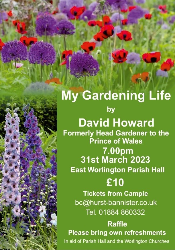 My Gardening Life – David Howard Fri 31-Mar-2023 by Martin Bond My Gardening Life, a talk by David Howard formerly head gardener to the Price of Wales: Friday 31st March 7:00PM. Tickets £10 from Campie (bc@hurst-bannister.co.uk 01884 860332).