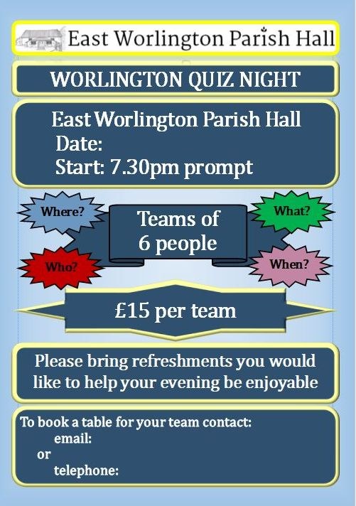 Quiz Night (1 or 2 times a year)We periodically host a fun quiz evening for teams of up to six people. There is a small entrance fee which is used to cover the cost of prizes, and to provide tea & biscuits during the interval. Quiz rounds typically have 10 questions and can cover anything and everything, it depends on the quiz master. Usually there are 8 rounds with a puzzle to work on during the interval. Team scores are displayed as the evening progresses to spice up the competitiveness. At the end of the quiz the first and second placed team are awarded prizes, which usually involve chocolate of some form (what else!). Once a year in November we hold the Winnie Memorial Quiz in honour of Winnie Corley who loved quizzing and was a stalwart of the East Worlington Parish quiz team. |