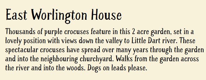 ‘The crocuses, which have spread naturally over many years, create a striking display across the two-acre garden and the neighbouring churchyard. The garden, set in a picturesque location with views down the valley to the Little Dart river, offers visitors the chance to explore beyond the flowers. Guests are welcome to walk down to the river, cross the bridge into the wildflower meadow-though not yet in bloom – and follow the public footpaths into the woods.