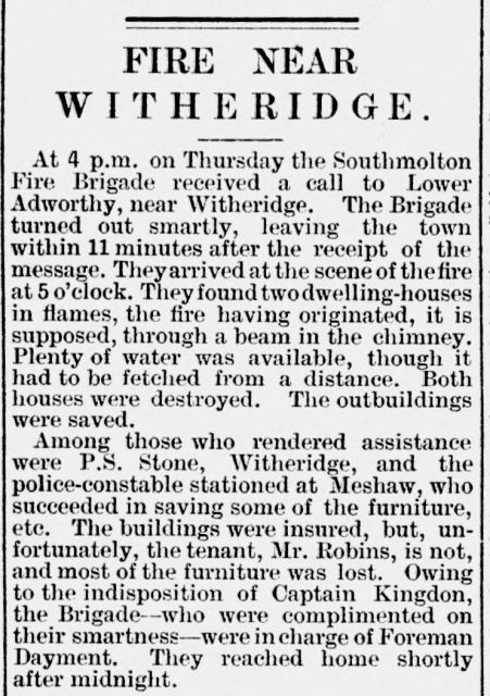 The Witheridge Historical Archive includes a memory from Mrs W Thomas who, as a young girl, lived at Lower Adworthy remembers seeing the farmhouse burned down, the fire as “pixies on the roof”, and the horse drawn fire engine from South Molton – she would have been 12 at the time.