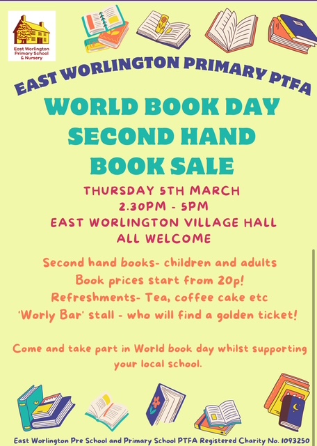East Worlington Primary PTFA are host a World Book Day pre-loved (second hand) book sale, with refreshments, on Thursday 5th March at the EW village hall.