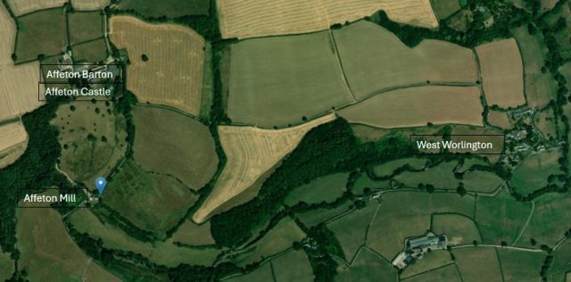 Affeton Mill is situated adjacent to the Little Dart River in the bottom of the valley immediately below Affeton Castle, at a distance of approximately 0.5 kilometers.